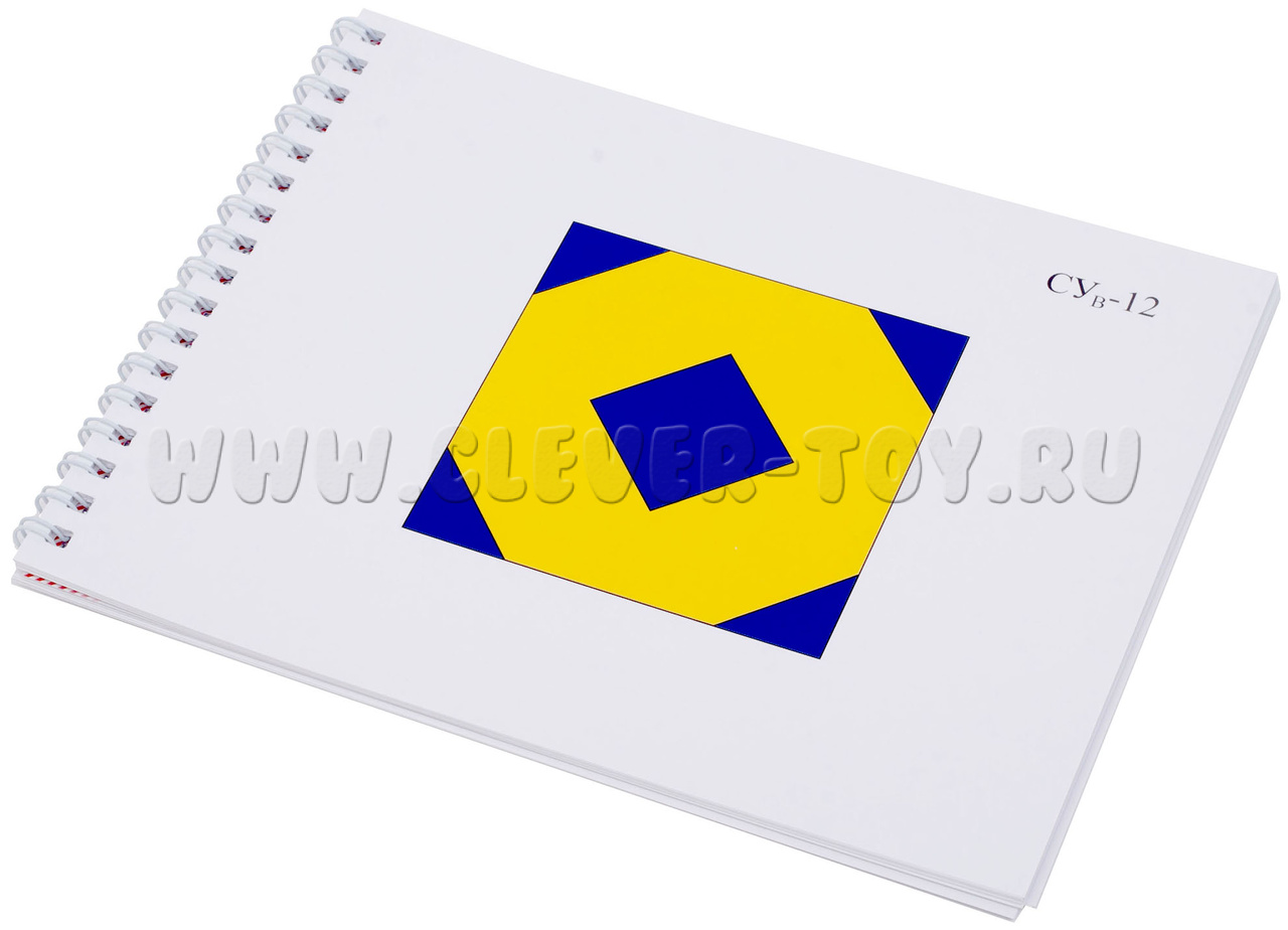 Альбом с заданиями для игры «Сложи узор». 24 цветные схемы в масштабе 1:1,5 предназначены для сборки фигур из 16-ти кубиков. Схемы представлены в цвете. Каждый рисунок расположен на отдельном листе. Листы в альбоме скреплены на пружине сбоку, это позволяет показывать задания по отдельности, ребёнок может сконцентрироваться на выполнении конкретного задания.