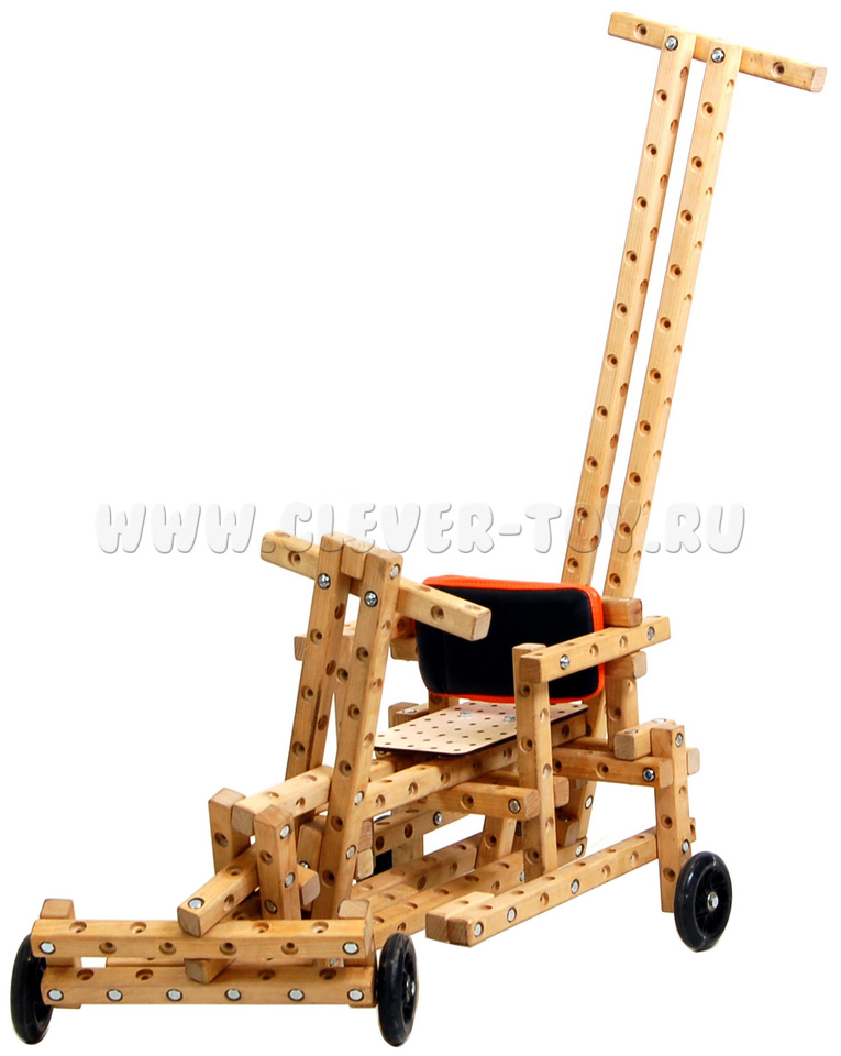 Состав конструктора “Дошкольник” включает 80 брусков из твёрдой уральской берёзы, около 300 болтов и гаек, сидушки с чехлами, колеса, шестерёнки, блок-ролики, ключи для сборки и систему хранения для мелких деталей.