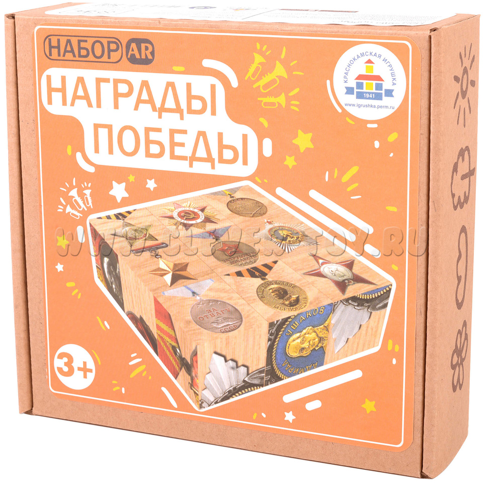 Набор интерактивных деревянных кубиков «Награды Победы» созданы к 75-летию победы в Великой Отечественной Войне. На них изображены ордена и медали, которые в годы войны изготавливались на Краснокамском Гознаке.
