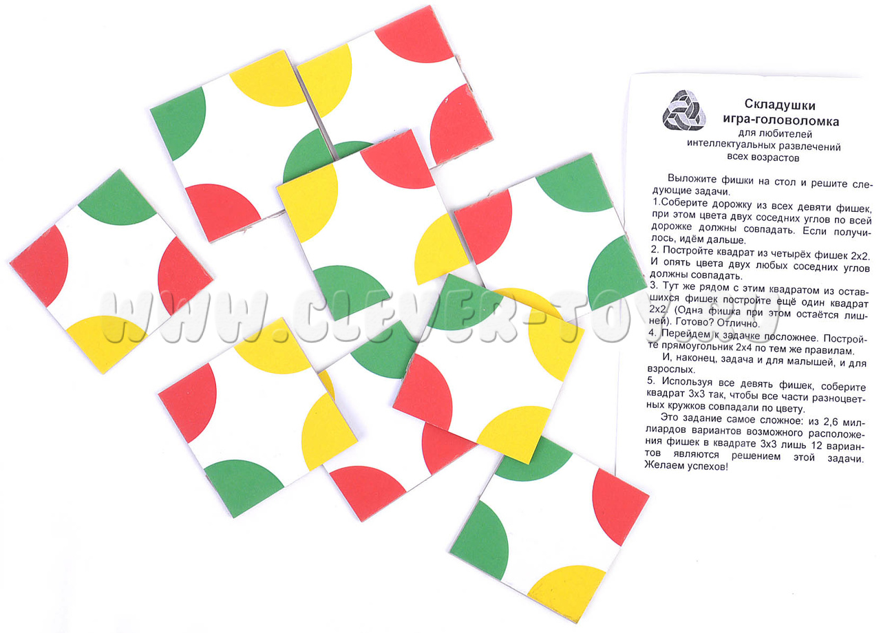Игровые элементы этой головоломки - набор из 9 квадратных фишек с нанесенными на их углах разноцветными секторами круга. Следуя инструкции попробуйте выполнить все задания: от простых до сложных.