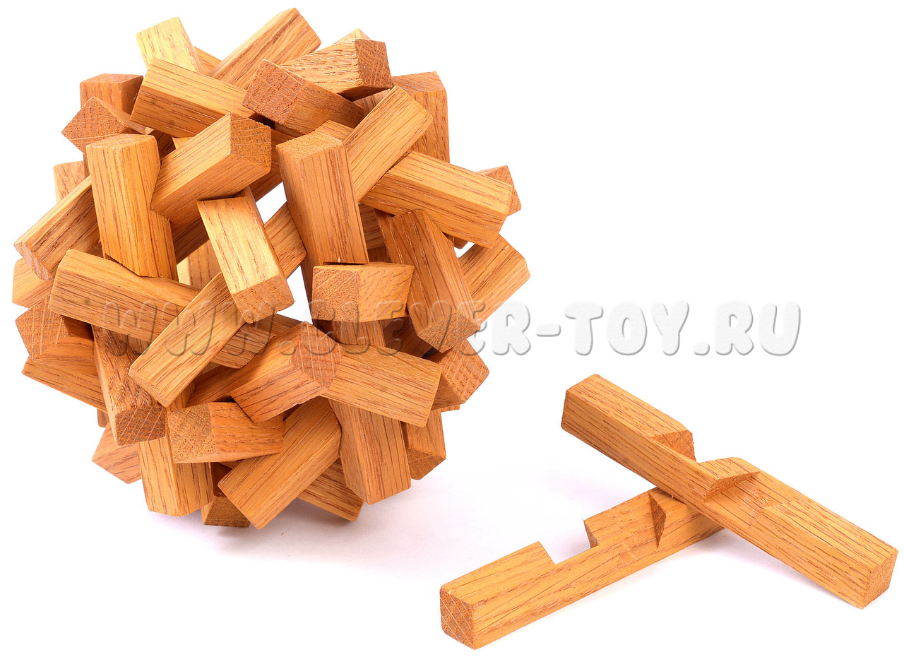 Этот деревянный узел состоит из 30 одинаковых брусочков, переплетенных между собой. Узел этот не сложно разобрать, но составить его снова будет не так просто.
