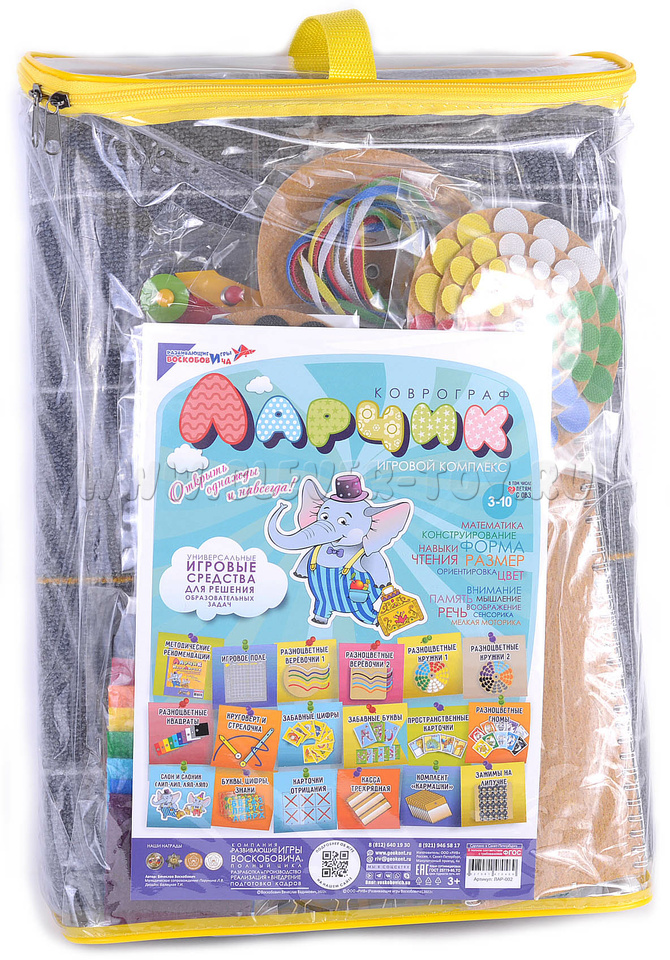 Универсальная игровая среда «Коврограф Ларчик» разработана ведущим специалистом в области раннего развития детей, физиком по образованию, отцом двух детей Вячеславом Воскобовичем. Цель развивающих игр Воскобовича - это гармоничное развитие у детей эмоционально-образного и логического начал.