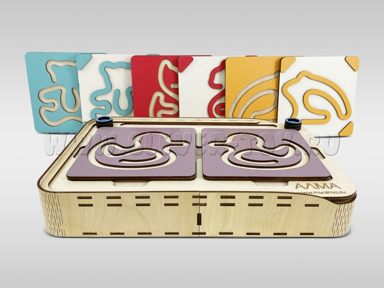 Два лабиринта с изображениями, расположенными симметрично, вставляются в пазы, и ребёнок проходит их с помощью специальных пальчиковых фишек.