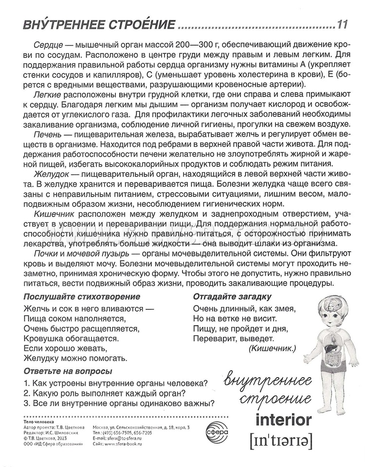 На каждой карточке вы найдёте красочные иллюстрации, краткие описания и интересные факты о различных частях тела. Благодаря этому материалу ваш ребёнок познакомится с анатомией человека, узнает о функциях разных органов и систем.