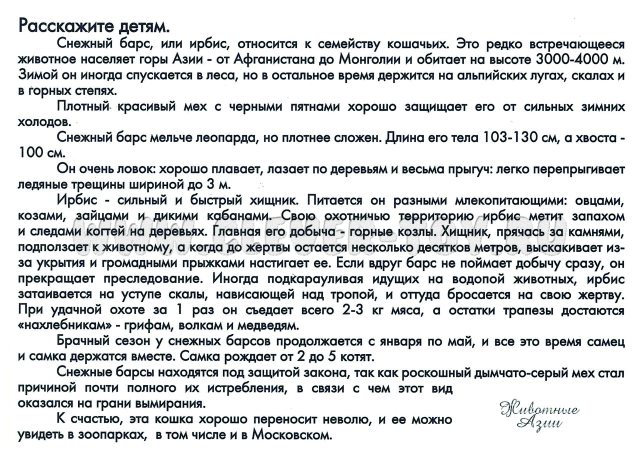 На одной стороне карточки расположена яркая картинка с изображением животного Азии (изображение детальное и реалистичное), на обратной стороне – доступная для ребёнка информация о животных (описывает внешний вид животного, ареал обитания, особенности питания и строения, интересные факты о происхождении животных Азии).