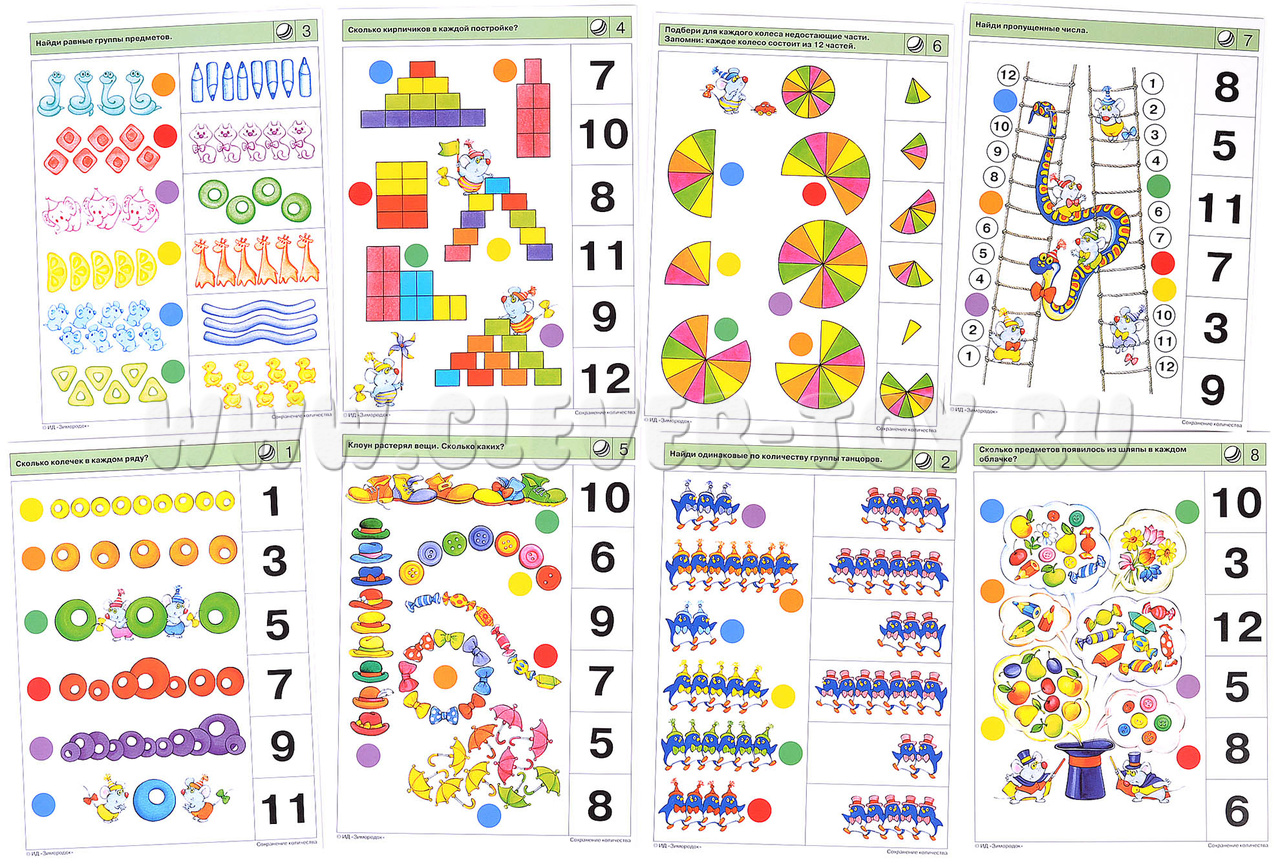 Задания настоящего комплекта предполагают последовательное знакомство ребёнка с принципом сохранения количества, который определяет независимость количества (числа) предметов от их расположения в пространстве, наличия либо отсутствия у них общих признаков (формы, величины, цвета, веса и т.д.). Ребёнок освоит приёмы оптимизации счёта: визуальный охват некоторого количества предметов; присчитывание к визуально узнаваемому количеству остальных предметов по единицам, двойкам, тройкам. Также уделяется внимание обучению вести прямой и обратный счёт, ориентироваться в отрезках натурального ряда чисел, узнавать и называть цифры. Примеры заданий в карточках: 2а. Найди одинаковые по количеству группы танцоров. 4б. Сравни две пирамиды мышат: что у них общего и чем они отличаются между собой? 5а. Клоун растерял вещи. Сколько каких? 7б. Назови числа на ступеньках лесенки и дорожке в прямом и обратном порядке. 8а. Сколько предметов появилось из шляпы в каждом облачке?