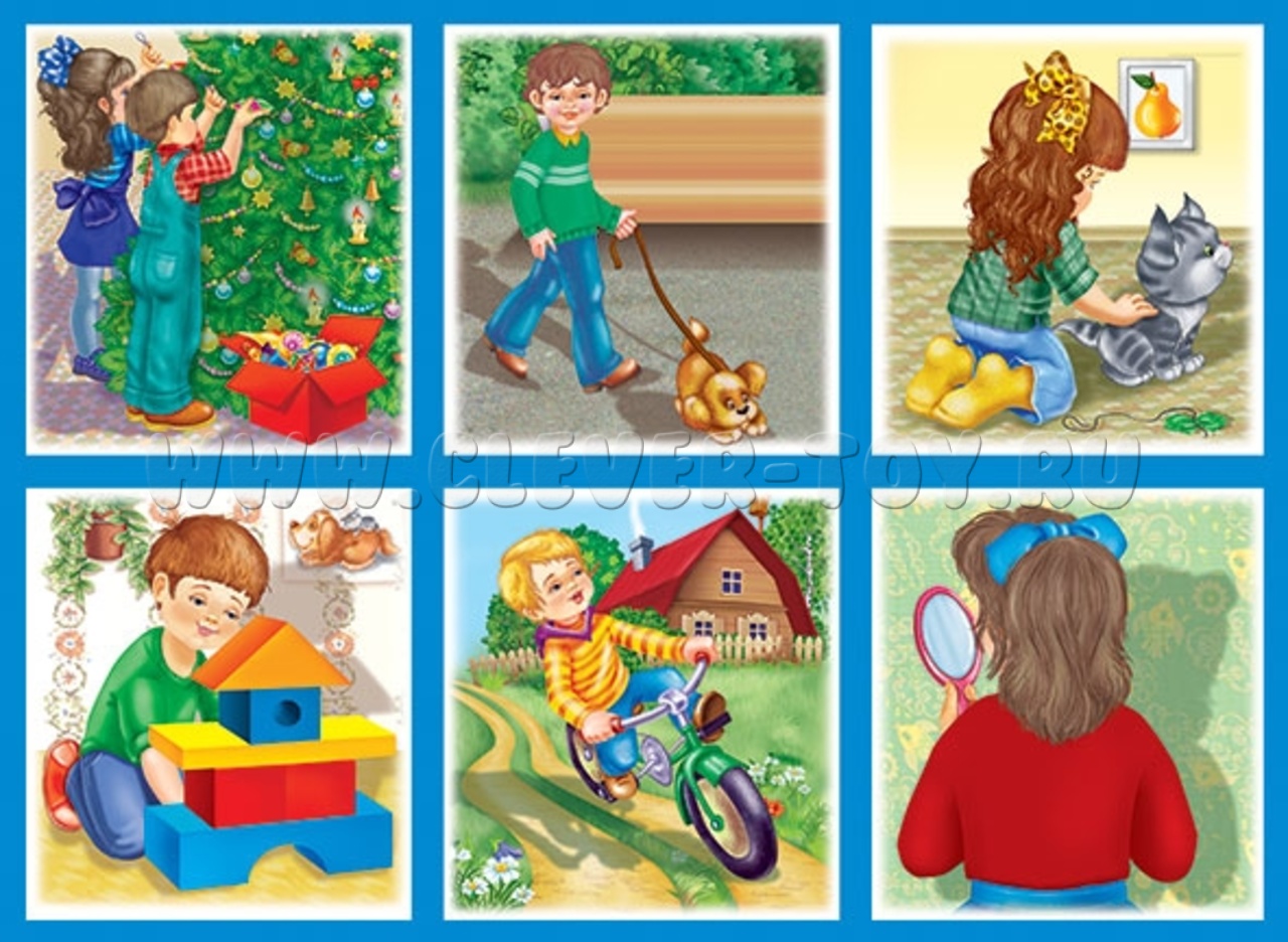 В составе набора карточки с сюжетными и предметными картинками и карточки с капельками, используемые в качестве вспомогательного материала.