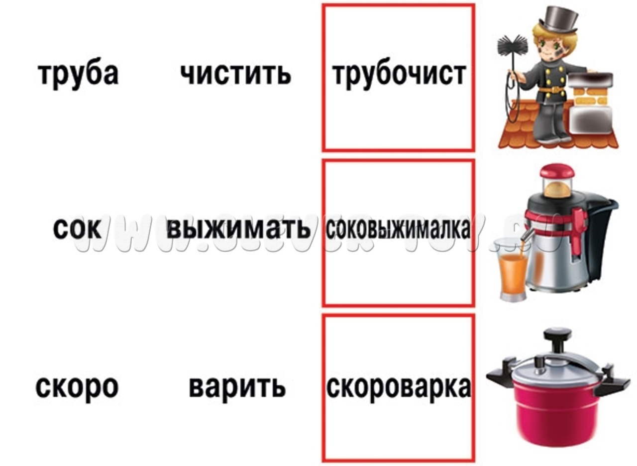 - Раздайте детям карточки со словами в красных рамках. Им необходимо подбрать подходящую к слову картинку и два слова-основы, из которых составлено слово в рамке;