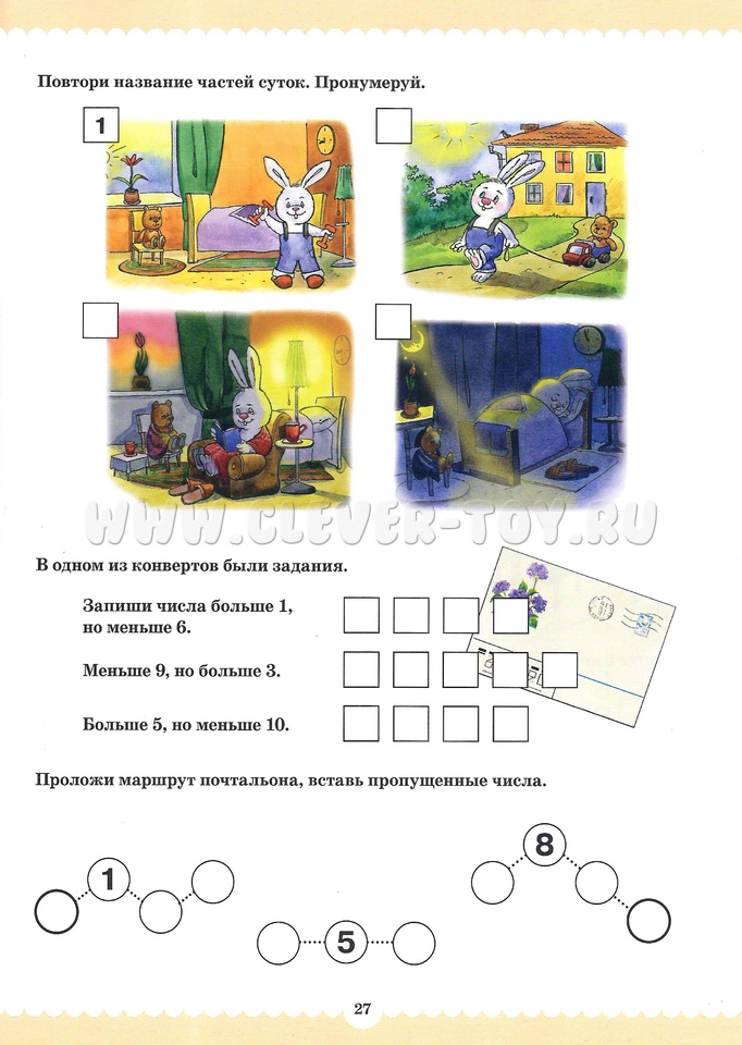 Вместе со сказочными персонажами Рыжиком и Пушистиком малыши, познакомятся с людьми разных профессий, закрепят знания цифр, вспомнят их последовательность в числовом ряду, познакомятся с составом чисел из двух меньших, узнают про сложение и вычитание, про математические знаки, научатся решать простые задачки, писать цифры.