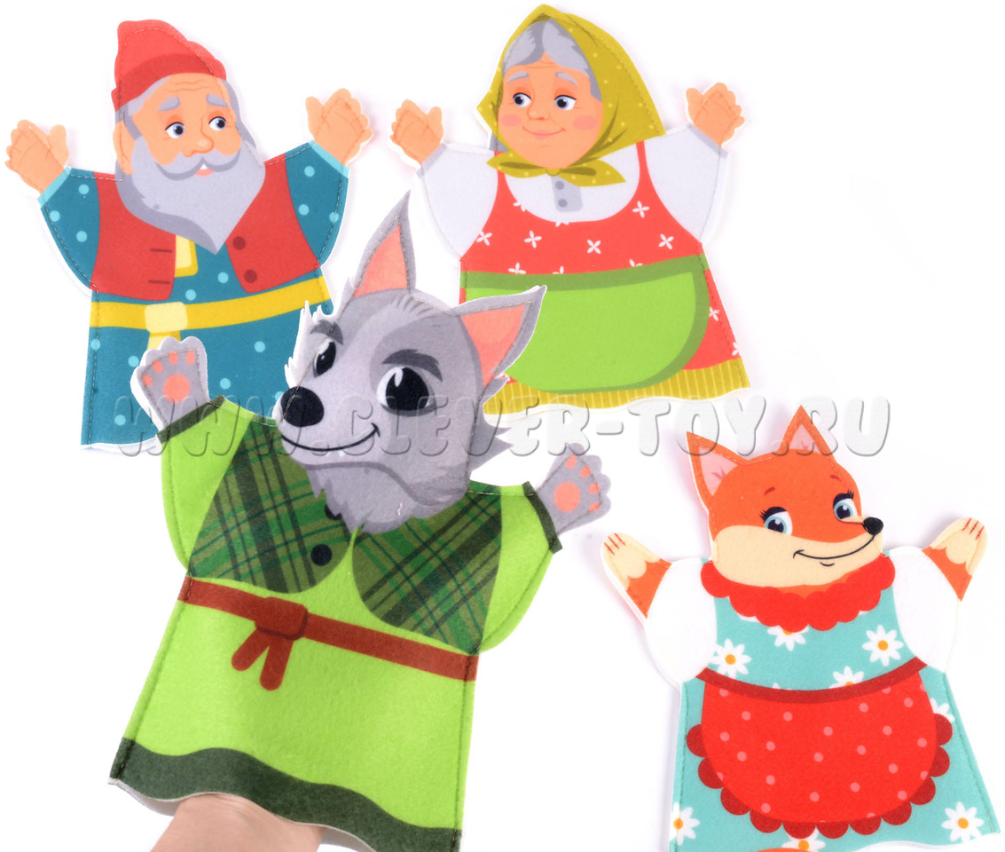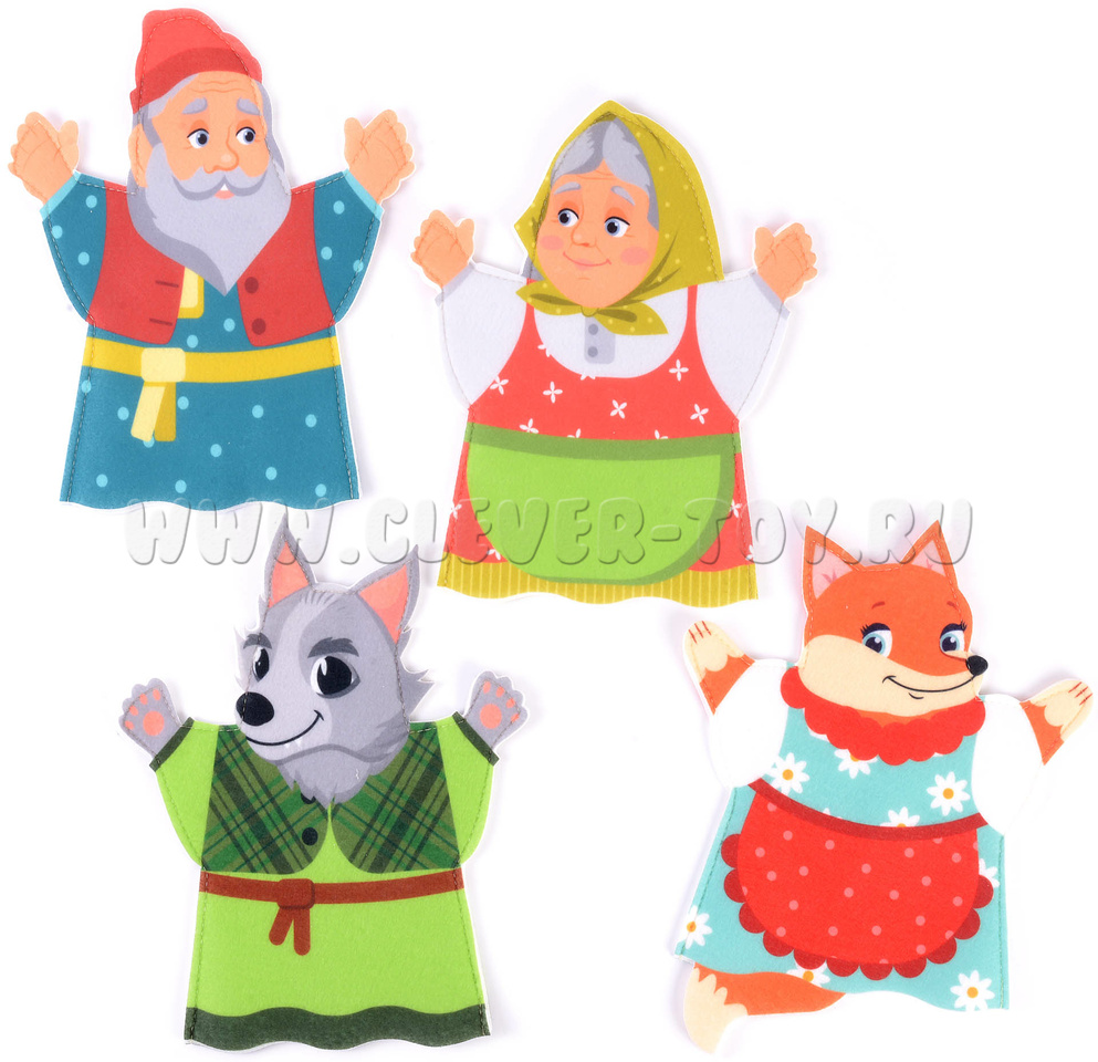 Четыре персонажа из сказки "Волк и лиса" на руку. Фигурки 23 см. Волк, лиса, бабка, дедка.