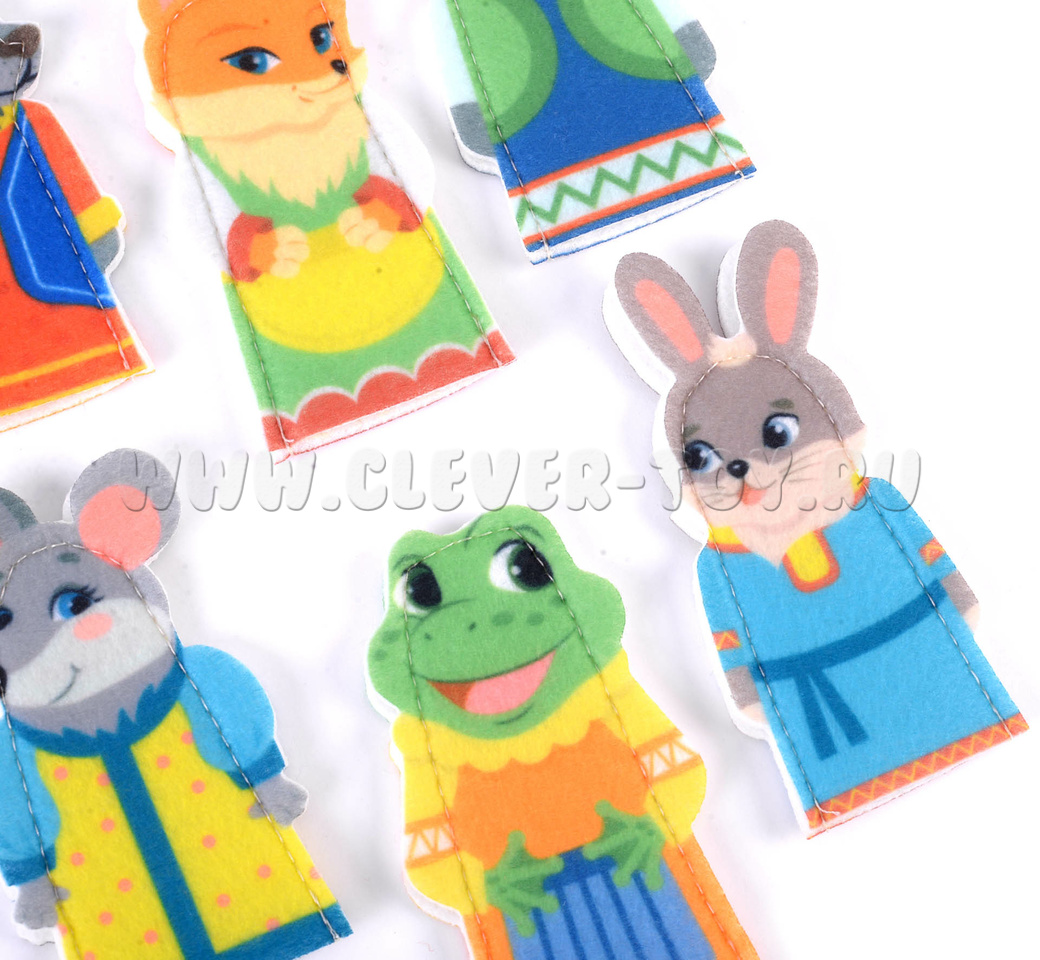 В комплект пособия входят пальчиковые куклы: мышка, лягушка, заяц, лиса, волк и медведь (6 шт.).