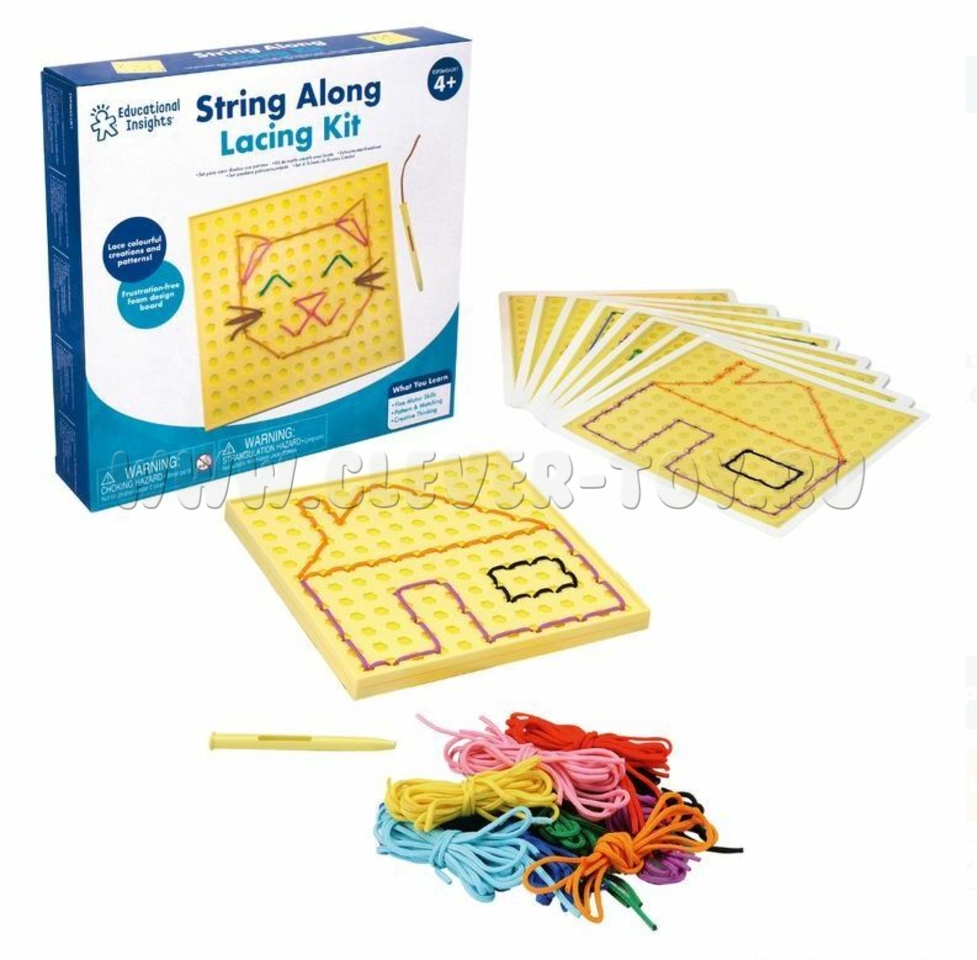 - 8 двусторонних карточек с шаблонами, с помощью которых дети смогу вышивать знакомые предметы, в том числе бабочки, автомобили, домашние животные и многое другое.