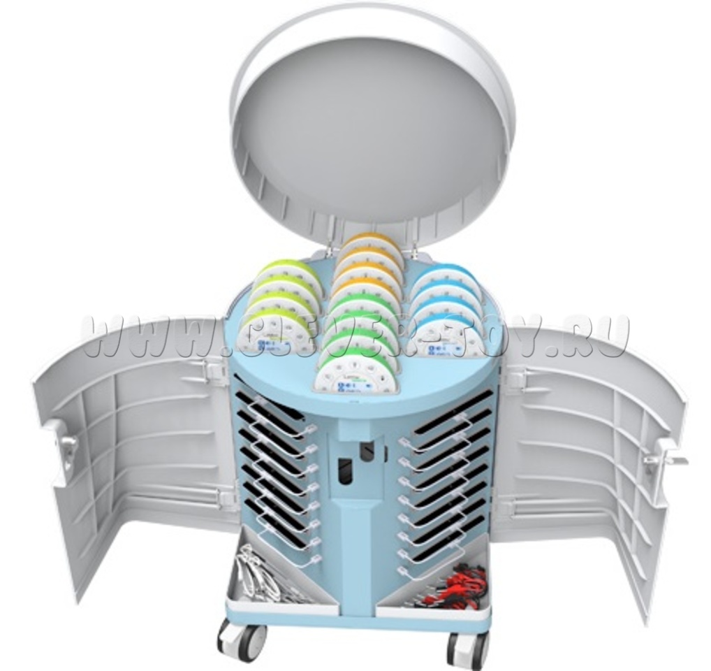 Мобильная тележка для хранения и подзарядки 16 ЛабДисков, в которую поместится любой набор цифровых лабораторий вместе с планшетами.